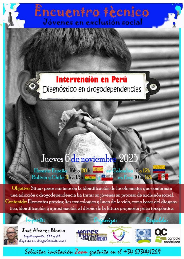 Para técnicos y profesionales que trabajen solidariamente (gratuitamente) con jóvenes en proceso de exclusión social, os invitamos a este encuentro técnico solicitado por la ONG peruana Virgen del Rosario, a favor del diagnostico en adicciones y/o drogodependencias.